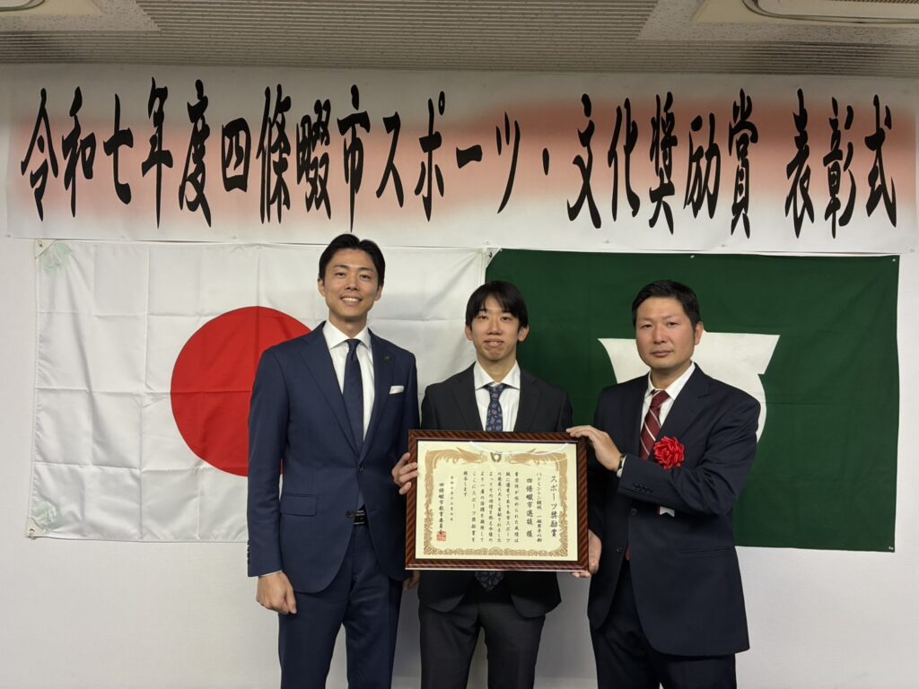 12月7日(日)、第79回大阪府総合体育大会バドミントン競技・一般男子の部において、当チームが優勝し、その功績が評価され「四條畷市スポーツ・文化奨励賞」を受賞しました。
