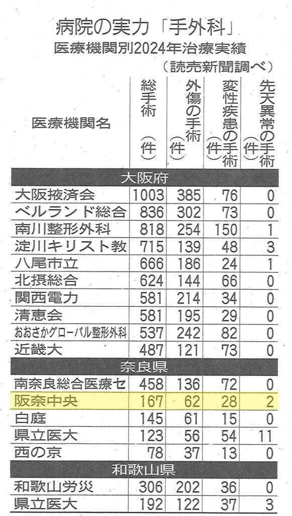 2026年3月22日の読売新聞紙面にて、医療機関別の「手外科」2024年治療実績が公開され、当院は奈良県内で2番目に多い手術実績を有する病院として掲載されました。