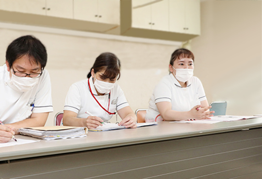 院内研修として、病院の委員会が主催する医療安全研修、感染予防研修、褥瘡に関する研修を、各々年に2回ずつ行い、病院全体のスキルアップを図っているほか、実地研修などのさまざまな教育制度で、個々のキャリア・スキルアップをサポートしています。