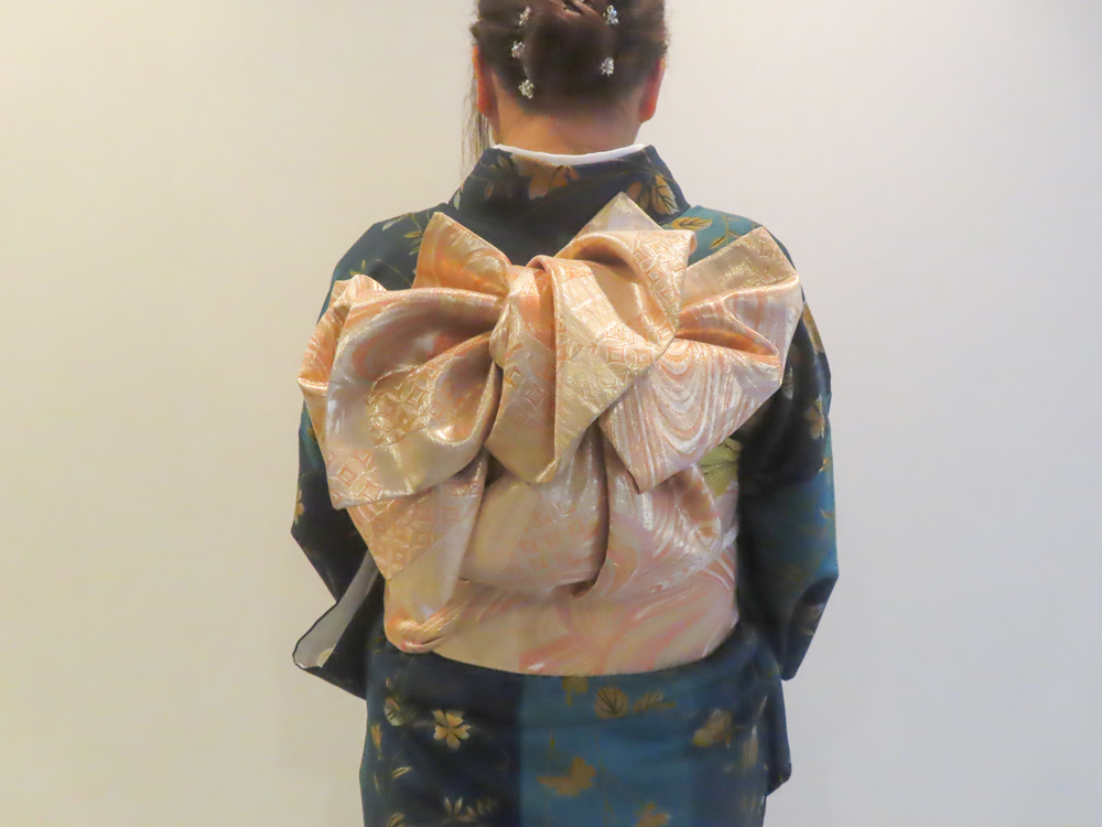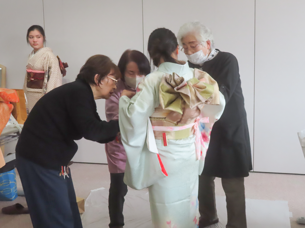訪問着・小紋・色無地などの中から好きな着物を選び、地域のボランティアの皆さんに着付けをしていただきました。袋帯の結び方によって印象が変わり、どの留学生もそれぞれに美しい装いとなりました💎