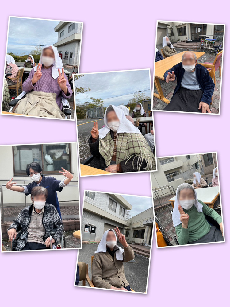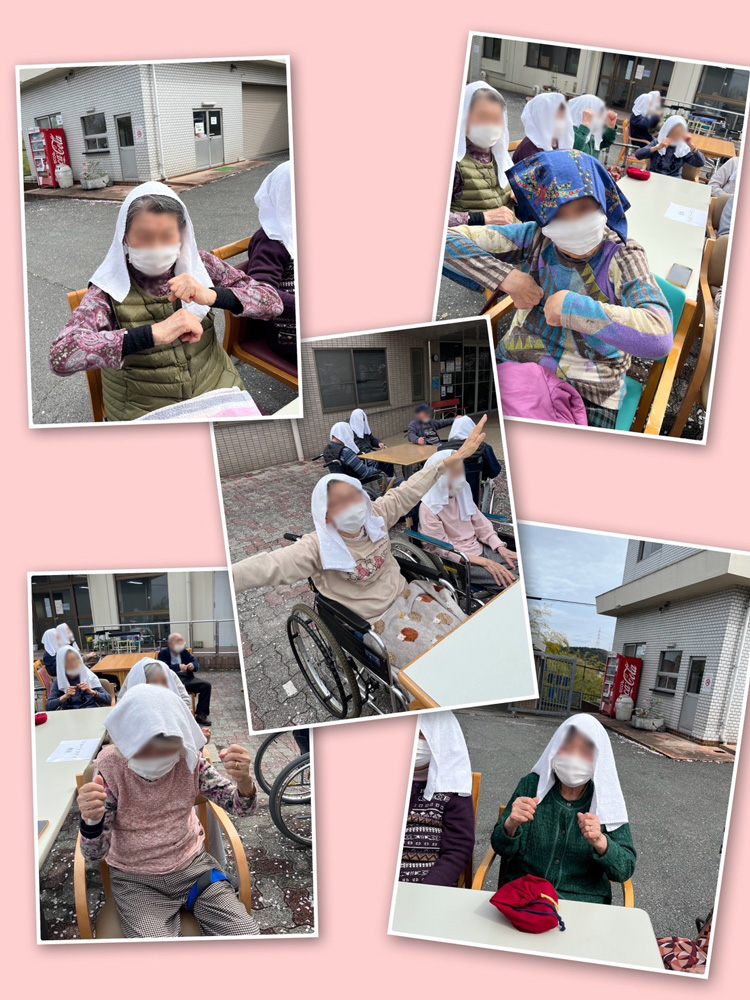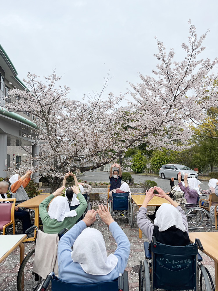 北玄関前の桜は、涼しい風が吹くたびにはらはらと花びらが舞って、その中で体を動かし、おやつを召し上がって頂き、声を合わせて歌っていると、自然と皆さまの笑顔があふれていました😊