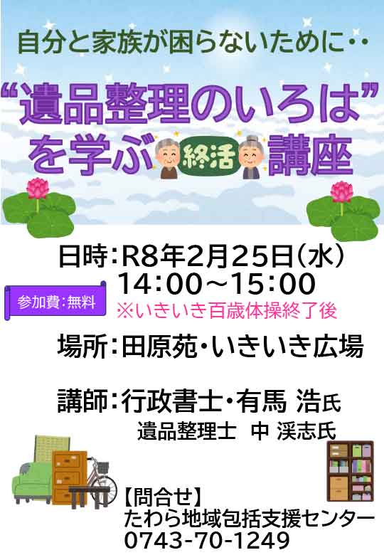 医療法人和幸会 > パークヒルズ田原苑 > たわら地域包括支援センター > 2月25日(水)開催 “遺品整理のいろは” を学ぶ終活 講座(申込不要) 2月25日(水)開催 “遺品整理のいろは” を学ぶ終活 講座(申込不要) 2026/02/16 (月) NEW 参加費: 無料 申 込: 不要 日時:R8年2月25日(水)時間: 14:00~15:00 ※いきいき百歳体操終了後場所:田原苑・いきいき広場 たわら地域包括支援センター