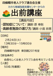 医療法人和幸会 > パークヒルズ田原苑 > たわら地域包括支援センター > 2月24日(火)開催 出前講座“認知症について” “高齢者施設の選び方”【要申込】 2月24日(火)開催 出前講座“認知症について” “高齢者施設の選び方”【要申込】 2026/02/17 (火) NEW 申込:要先着50名日時:R8年2月24日(火)13時30分~15時00分参加条件:会員もしくは老人クラブ入会を考えている方場所:四條畷市役所 東別館201号室申込先:四条畷市老人クラブ連合会(TEL:072-878-1210) たわら地域包括支援センター