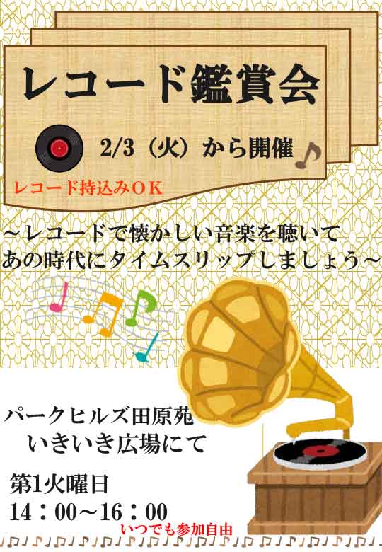 医療法人和幸会 > パークヒルズ田原苑 > たわら地域包括支援センター > たわら地域 通いの場に新しく「レコード鑑賞会」を追加しました! たわら地域 通いの場に新しく「レコード鑑賞会」を追加しました! 2026/02/18 (水) NEW ~レコードで懐かしい音楽を聴いて、あの時代にタイムスリップしましょう~ 開催日:第1火曜日時 間:14:00~16:00 たわら地域包括支援センター