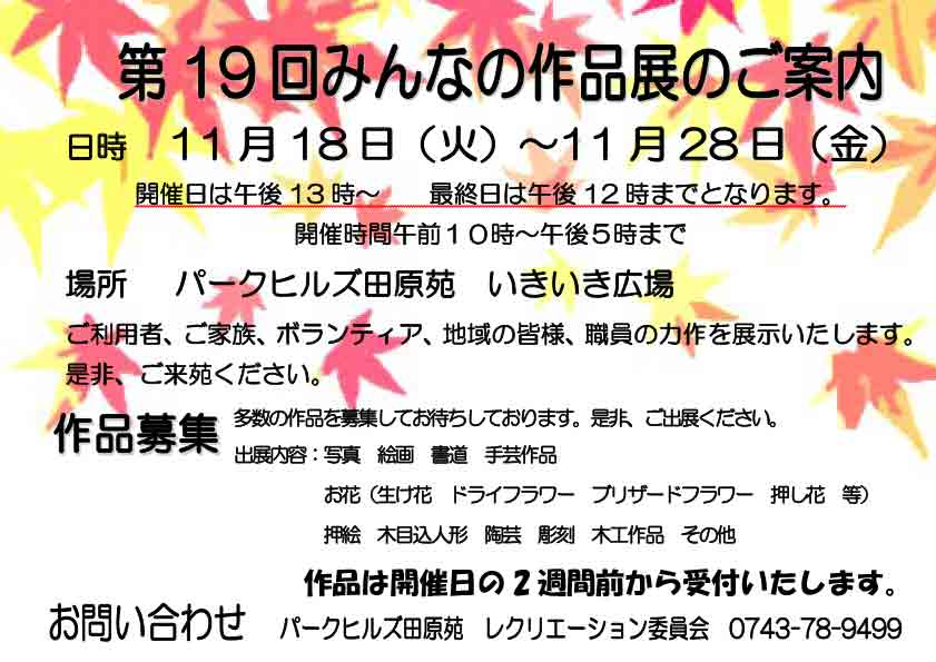 | お問い合わせ | パークヒルズ田原苑 レクリエーション委員会 0743-78-9499 協力:たわら地域包括支援センター |